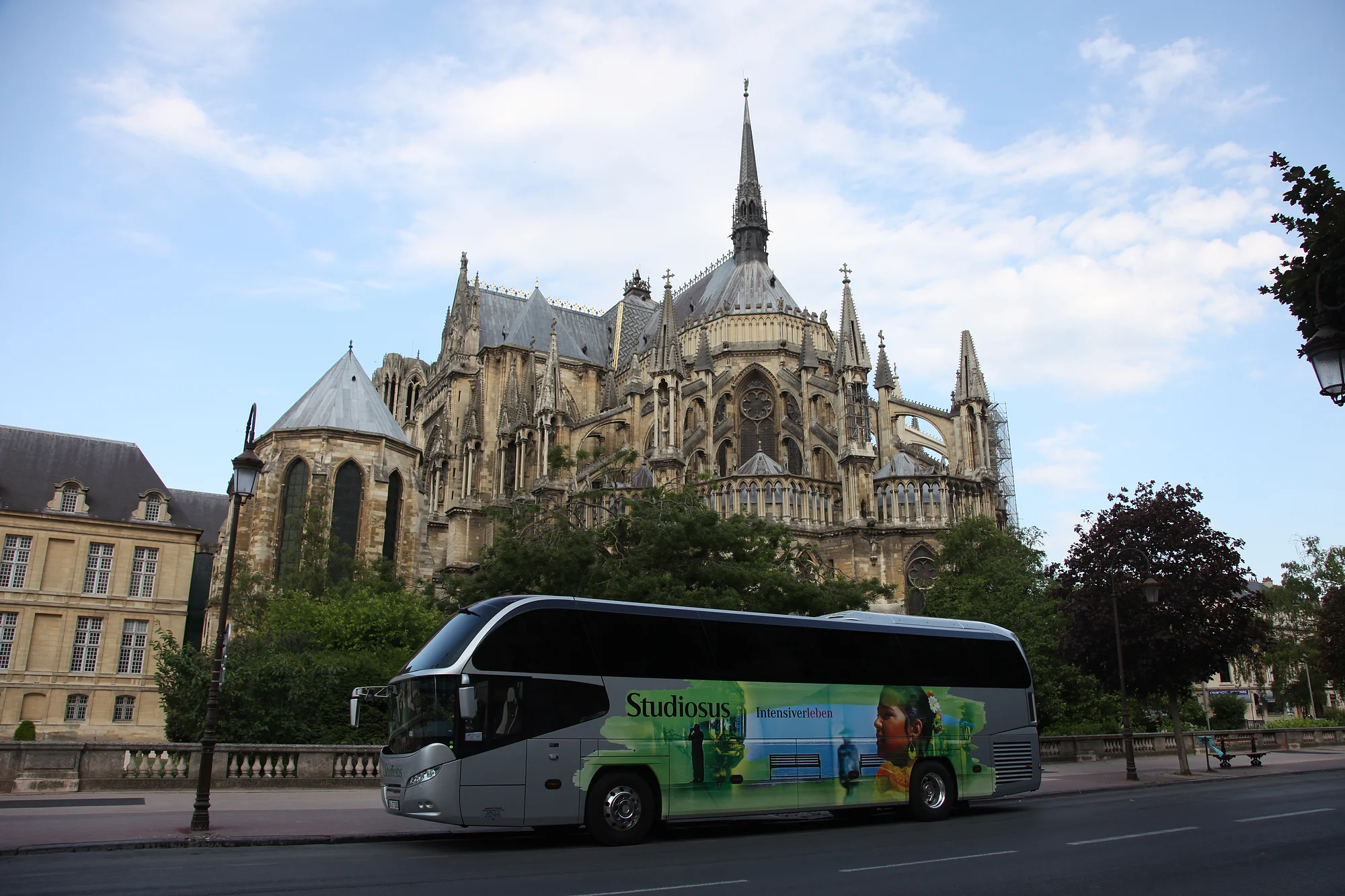 Die gotische Kathedrale Notre-Dame de Reims war über Jahrhunderte der Krönungsort der französischen Könige. Sie gilt als Meisterwerk gotischer Baukunst mit reich verzierter Westfassade, bemerkenswerten Glasfenstern und bedeutender Rolle in der französischen Geschichte.