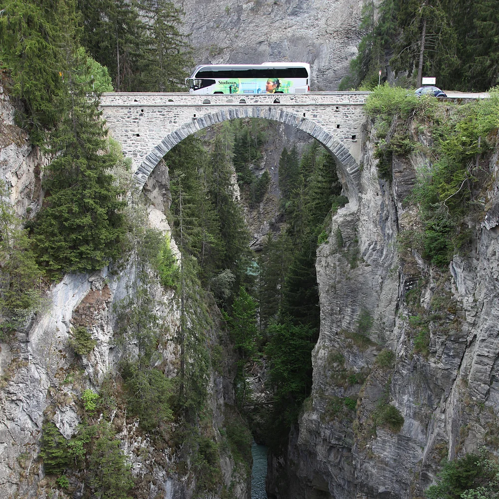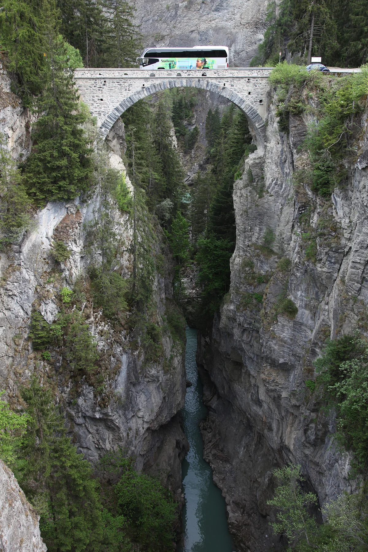 Die Viamala-Schlucht im Kanton Graubünden beeindruckt mit steilen Felswänden und einer spektakulären Straßenführung. Die moderne Bogenbrücke bei Thusis überspannt die Schlucht in luftiger Höhe – historisch war der Weg Teil der alten Transitroute über die Alpen.