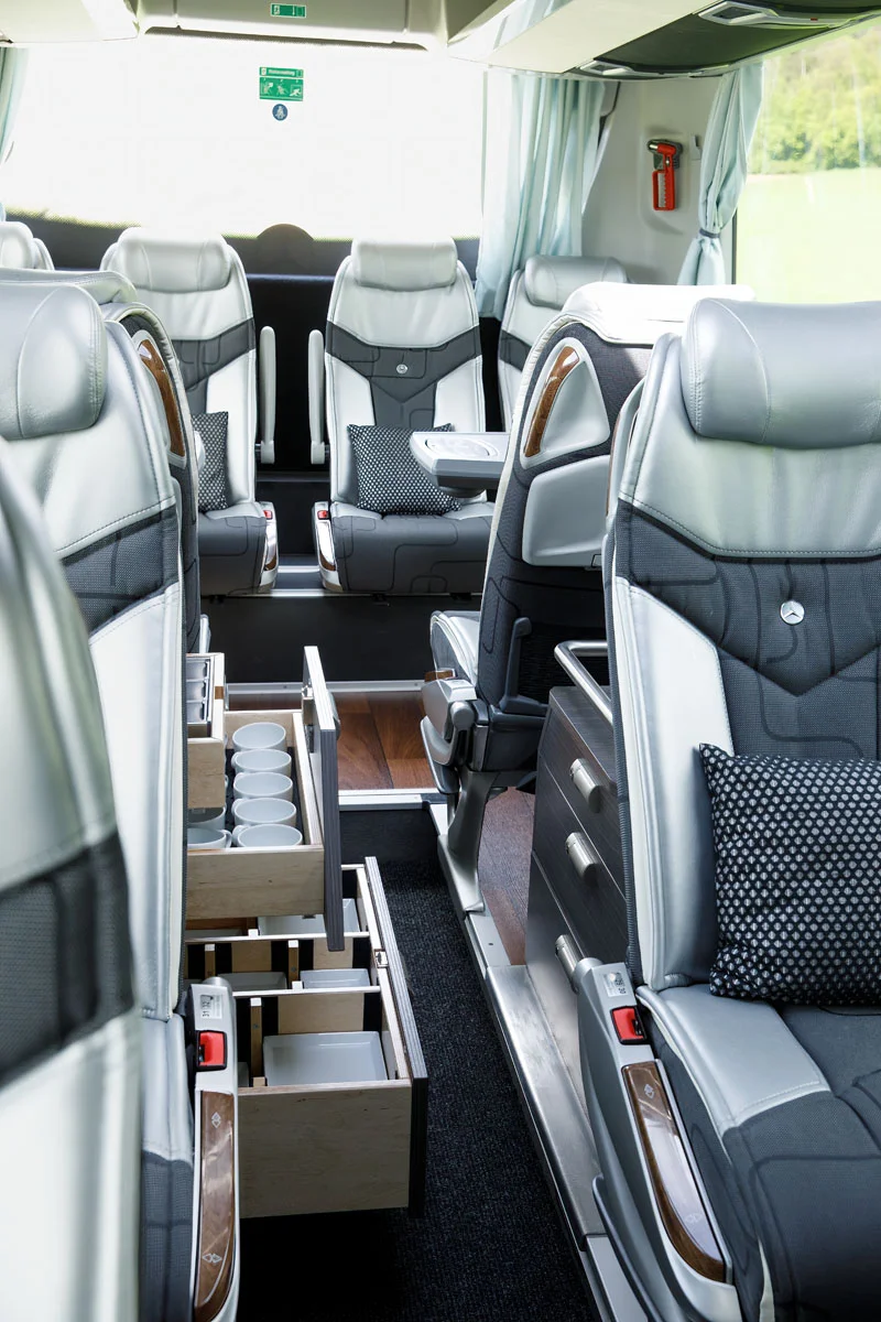 Alle unsere Reisebusse verfügen über verstellbare Sitze und Rückenlehnen, Klimaanlage, WC und Kühlschrank. Sie müssen lediglich einsteigen, sich zurücklehnen und können die Fahrt in unseren modernen und komfortablen Bussen genießen